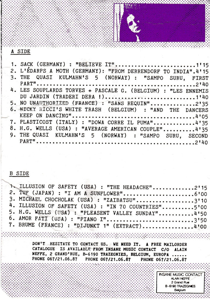 Registrato con Teac M-144 a quattro piste nel 1985, pubblicato all’ interno del Vol. 21 di INSANE MUSIC FOR INSANE PEOPLE, compilation su cassetta curata da Alain Neffe.